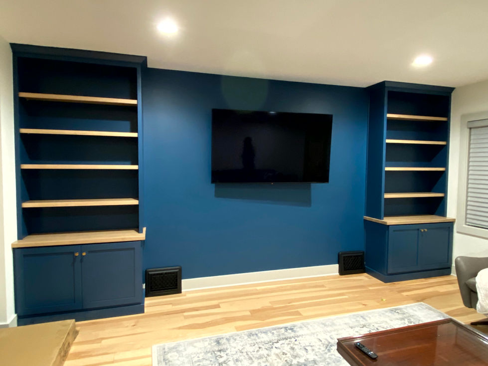 The design involved an inviting aesthetic with features such as natural wood flooring, modern stainless-steel appliances from Z-Line, and a black quartz countertop. A desk area with open shelving, a butcher block countertop, and a lovely map focal wall.